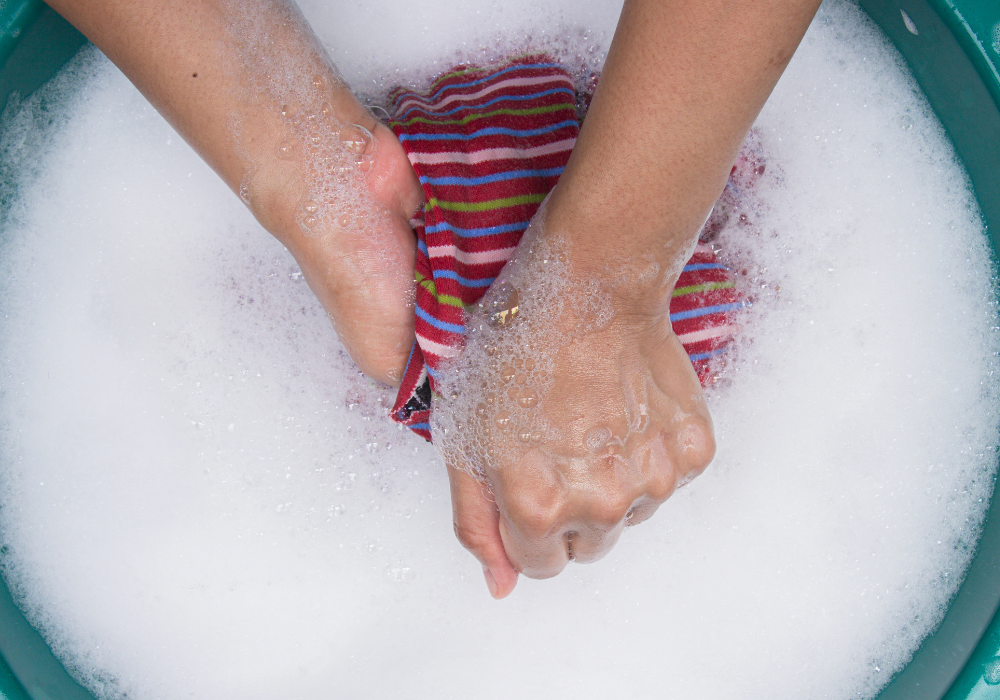 2. Washing clothes on a washboard to achieve a deep clean.